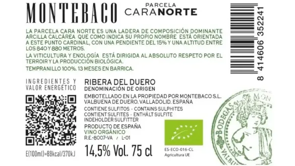 Montebaco Parcela Cara Norte es un tinto procedente de agricultura ecológica, elaborado íntegramente con uvas de la variedad Tempranillo seleccionadas en la Denominación de Origen Ribera del Duer…